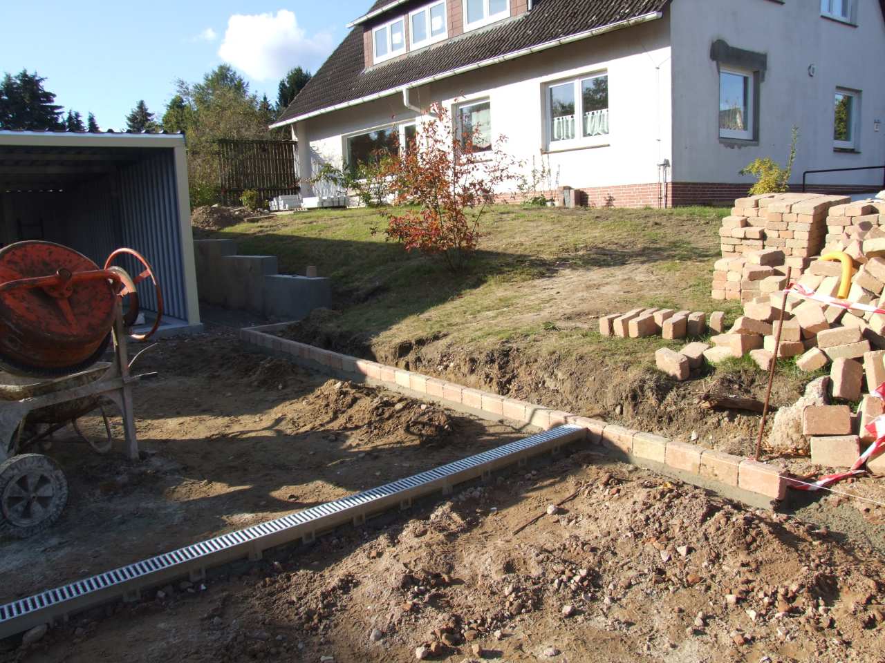 Randeinfassungen in Beton gesetzt und die Drainagerinne eingebaut.